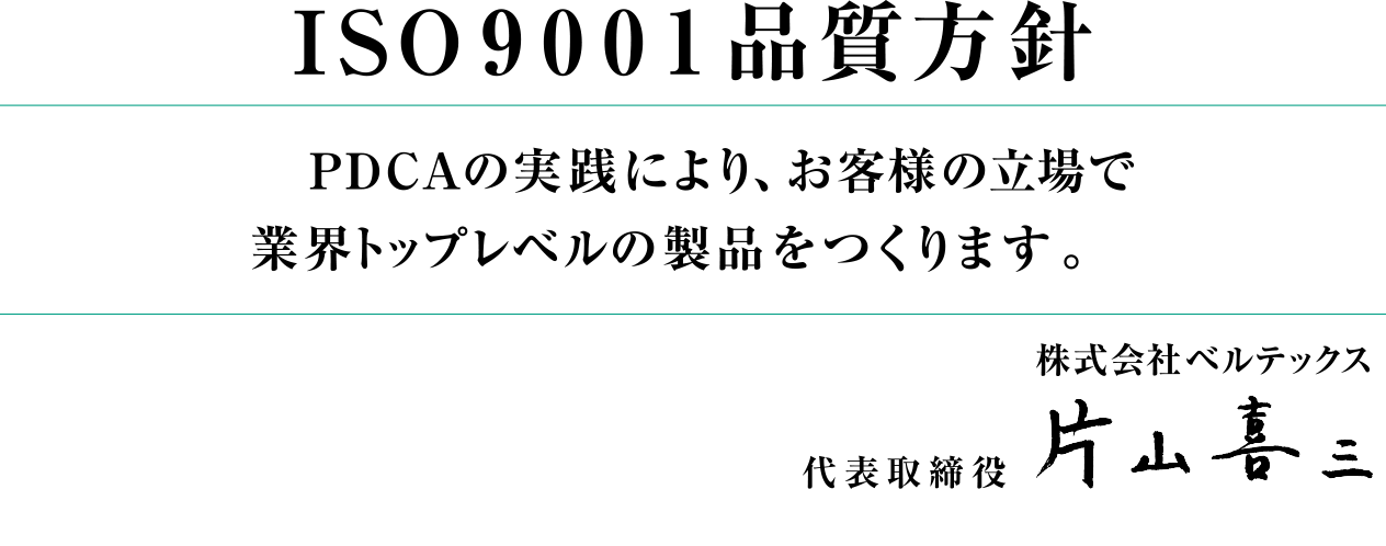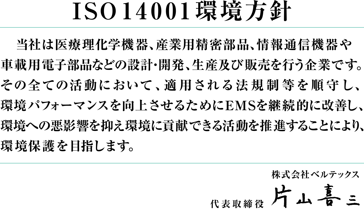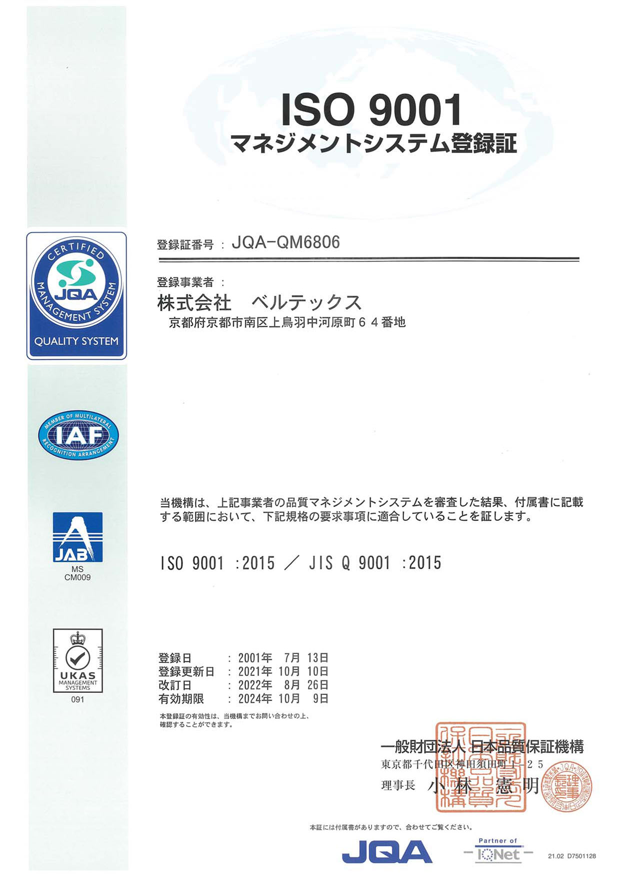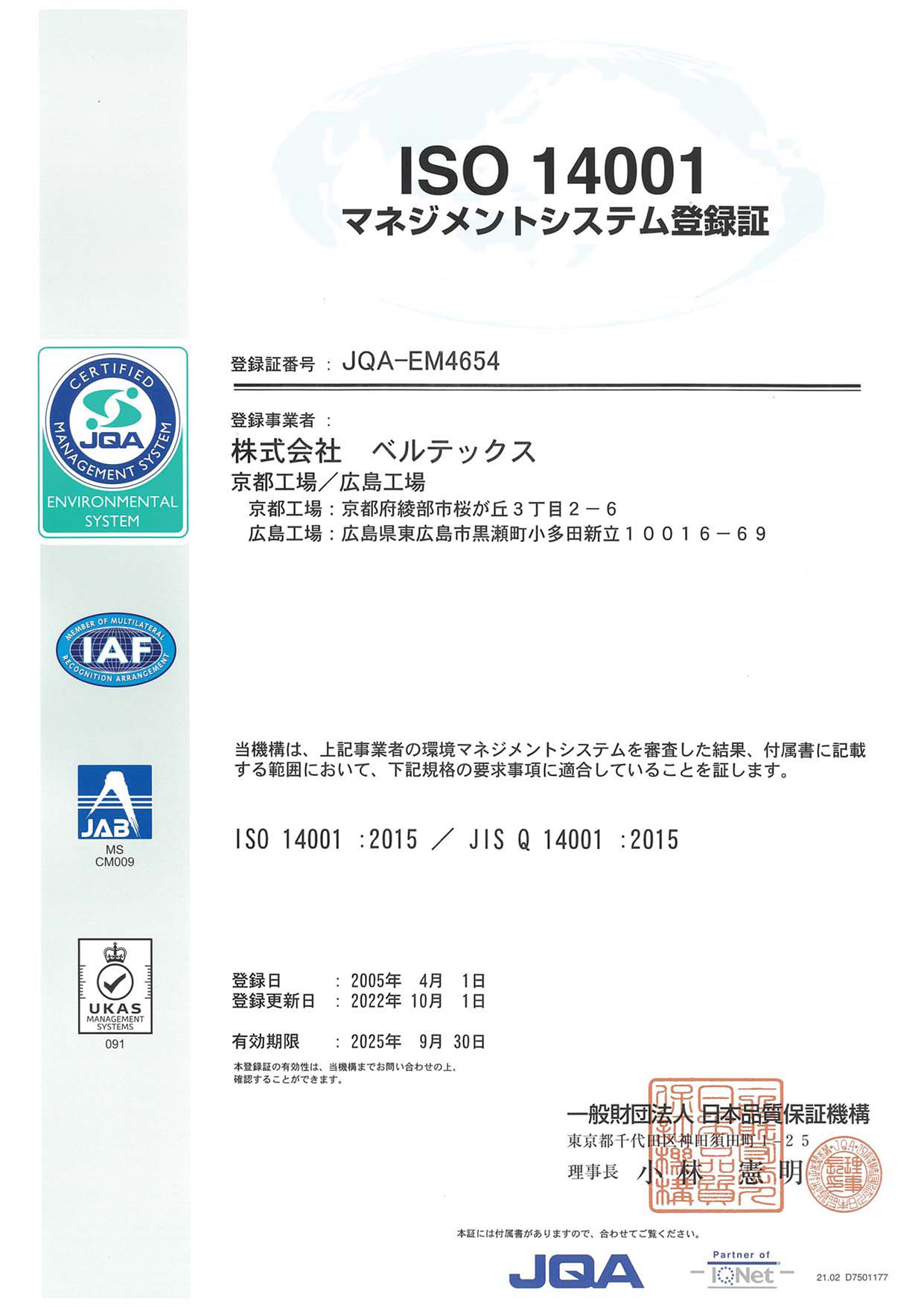 株式会社ベルテックスは、お客様に満足していただける品質をご提案するために、品質マネジメントシステム「ISO9001」の 認証を取得しました。また、ものづくりにおいて科学技術や生産技術の向上だけを追及するのではなく、人とテクノロジーのより良い関係を保ち、 地球環境にやさしい企業を実践するために、環境マネジメントシステム「ISO14001」の認証を取得しました。