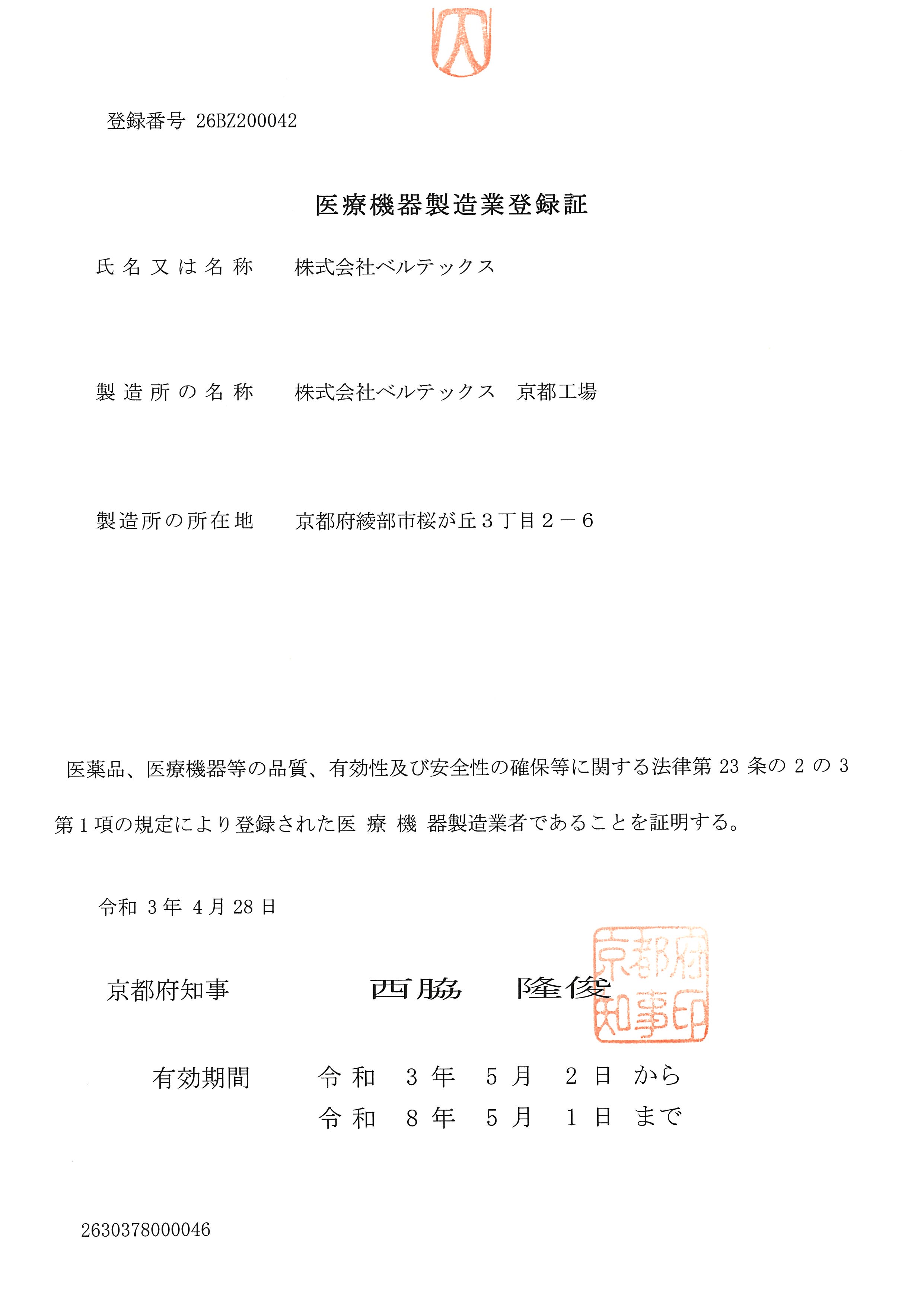 | 製造所の名称 | 株式会社ベルテックス 京都工場 |