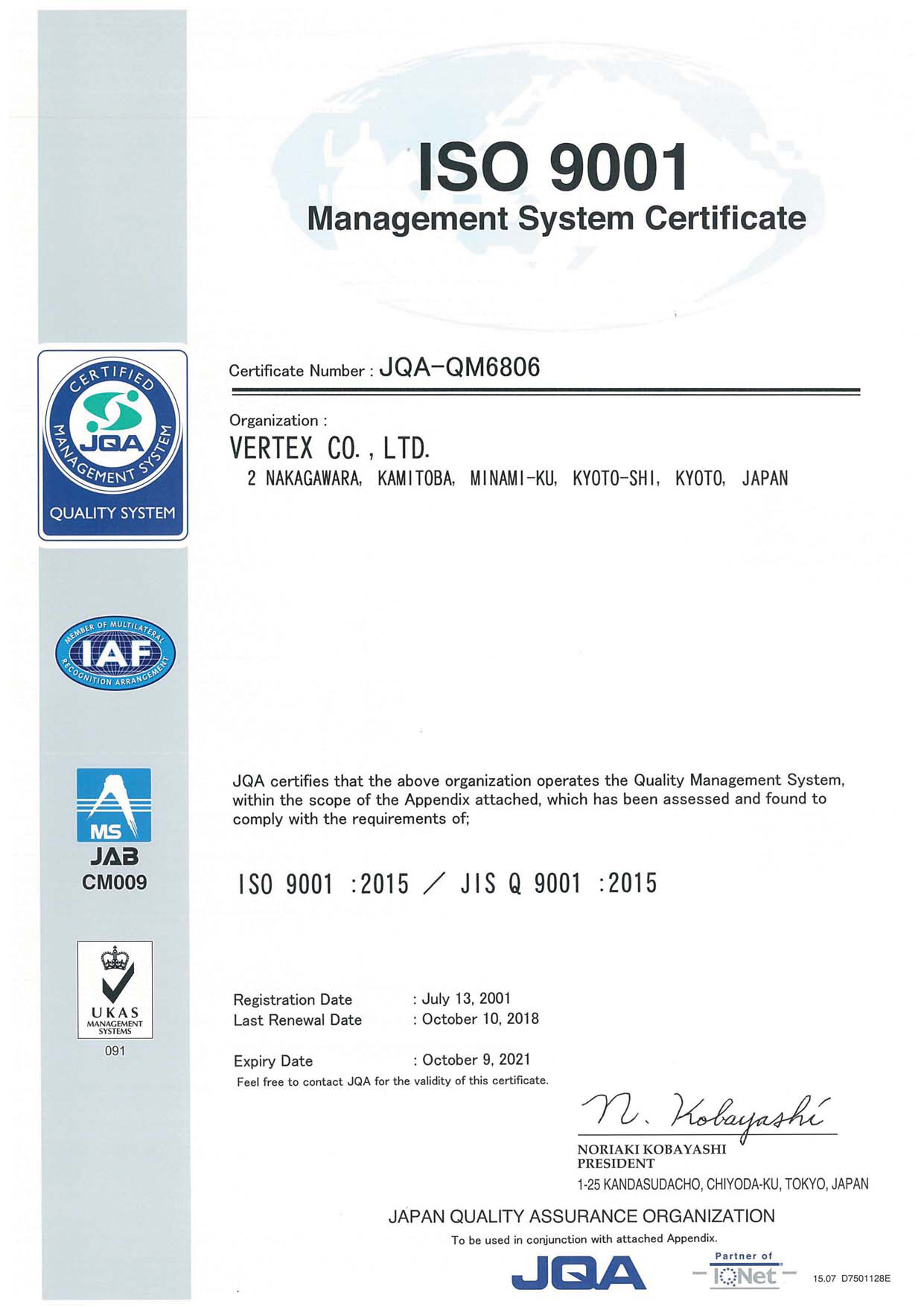 To supply quality which fully satisfies our customers, Vertex Corporation has obtained ISO9001 certification. Vertex also obtained ISO14001 certification, the environmental management system, to realize a corporate attitude fully conscious of global environmental issues with a better human-technology relationship, adding to improved scientific/production technologies. Further, Vertex has achieved ISO13485 certification so that our technology can contribute to medical care, an area that attracts great interest.