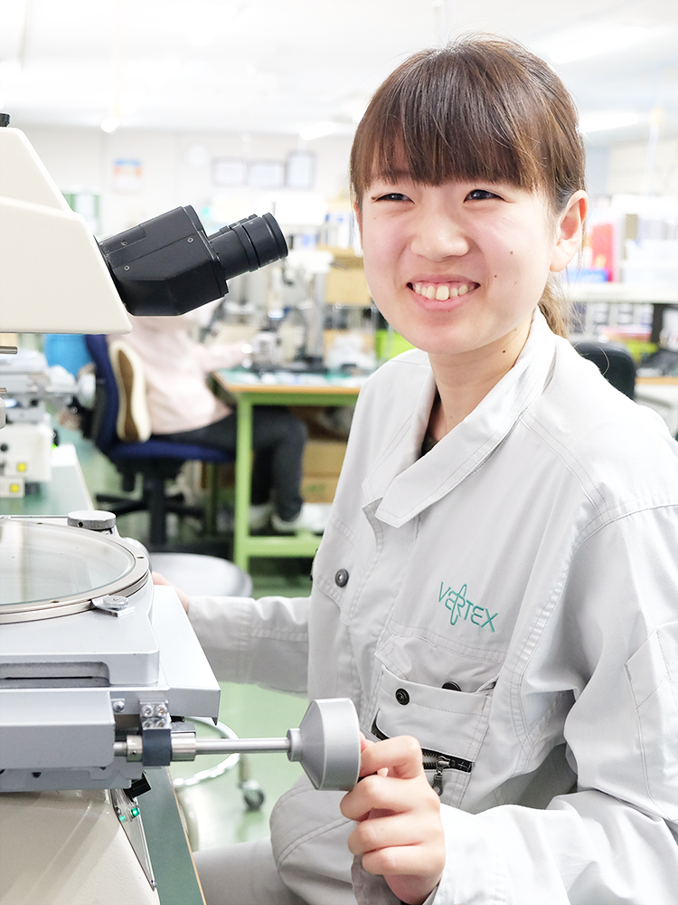 高校在学中にベルテックスの求人票を見て、休日の数、通勤距離、仕事内容などで決めました。あとは、高校の時に材料工学を勉強したので少しは役に立つかな、と考えたことや、ISO認証の取得をしているところも選んだ理由になります。