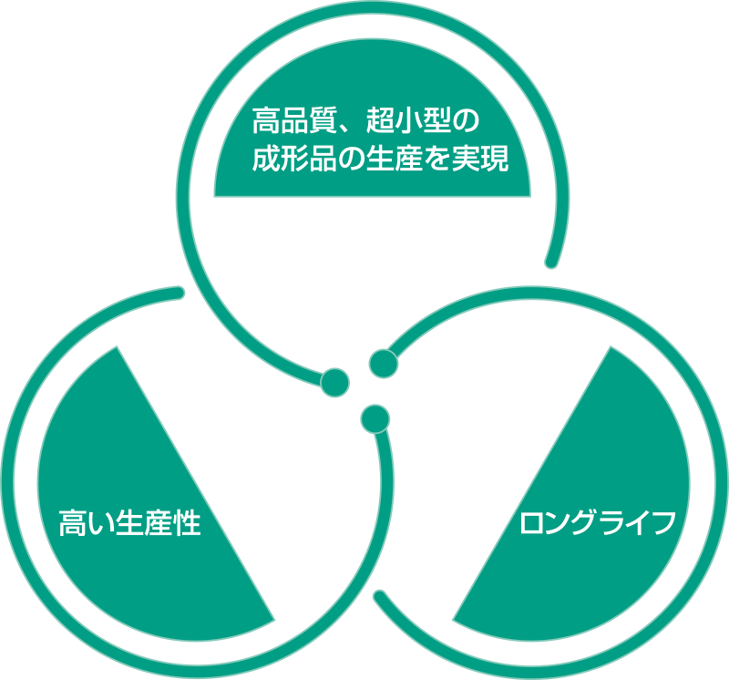金型の設計製作から成形量産、2次加工及び組立までを一貫して自社工場内で行なっています。これにより工程間や技術者の連携がスムーズになり、試作から量産化までの流れにおいてムダやロスが飛躍的に少なくなります。また、一貫生産により、製品と金型製作の受注条件を限定せずにトータルで対応することが可能となります。